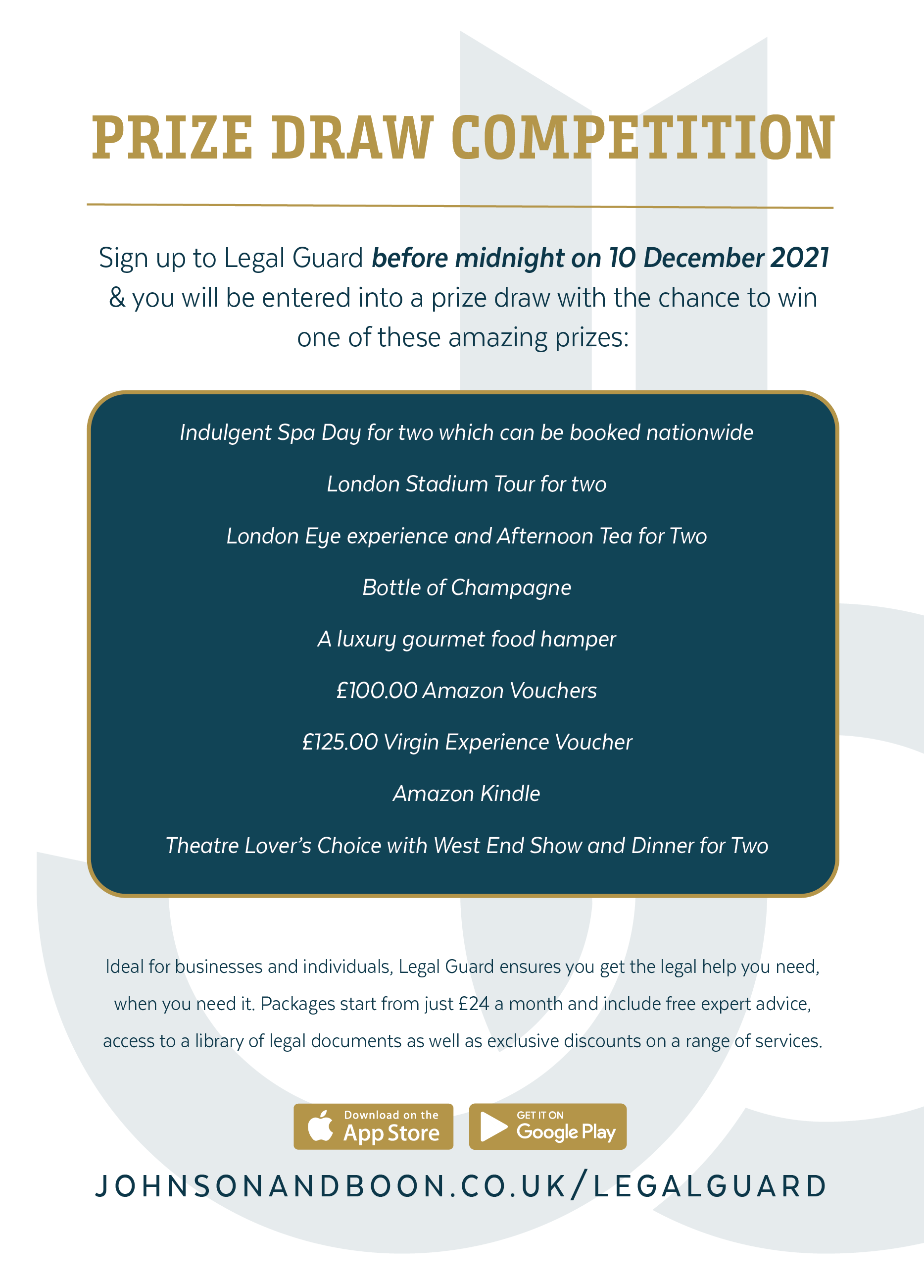 Anyone who signs up to our unique membership scheme, Legal Guard, before midnight on 10 December 2021 will automatically be entered into a FREE prize draw along with all our existing members, with the chance to win a Spa Day for two, West End tickets, £100.00 worth of Amazon Vouchers, and much more.